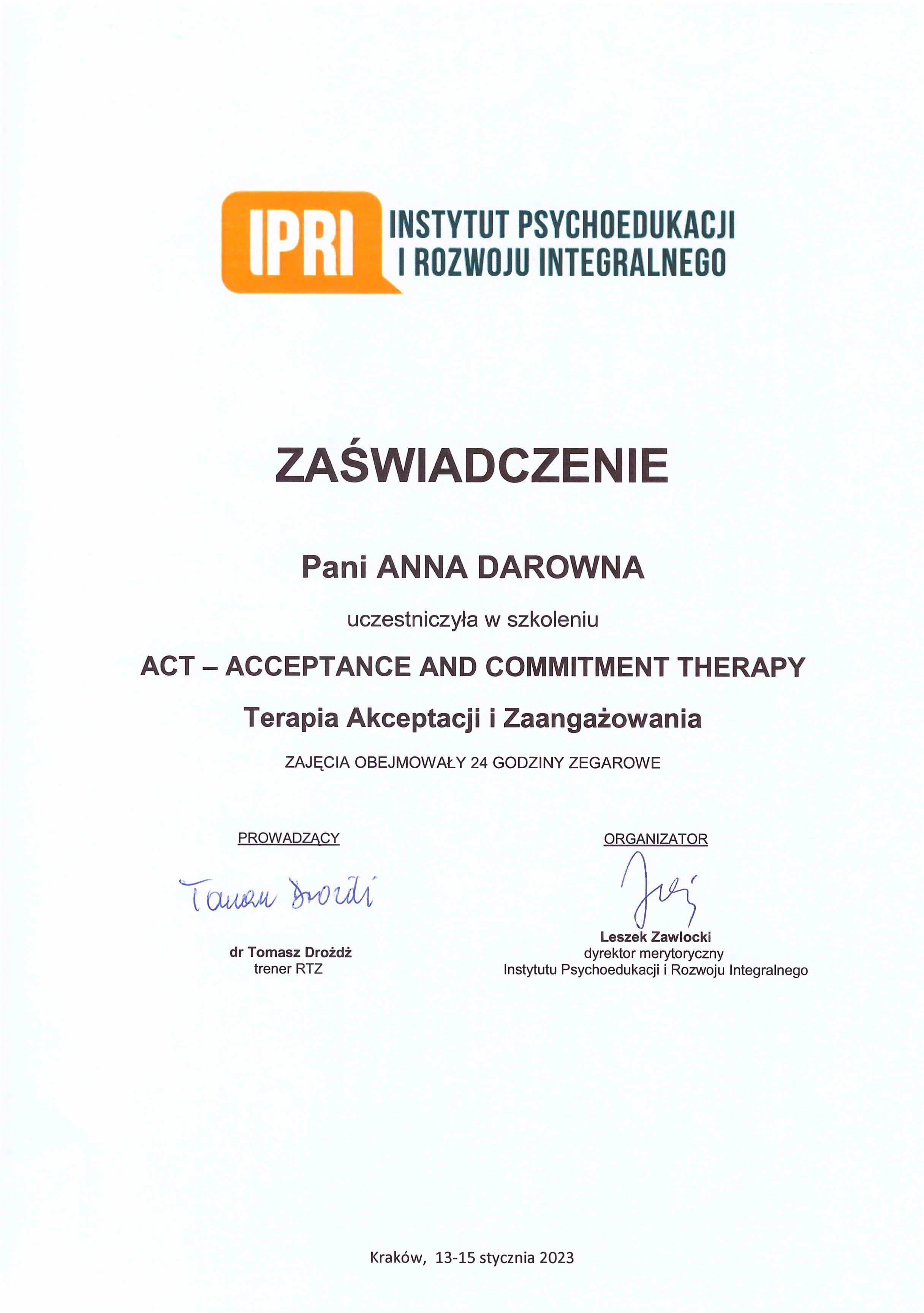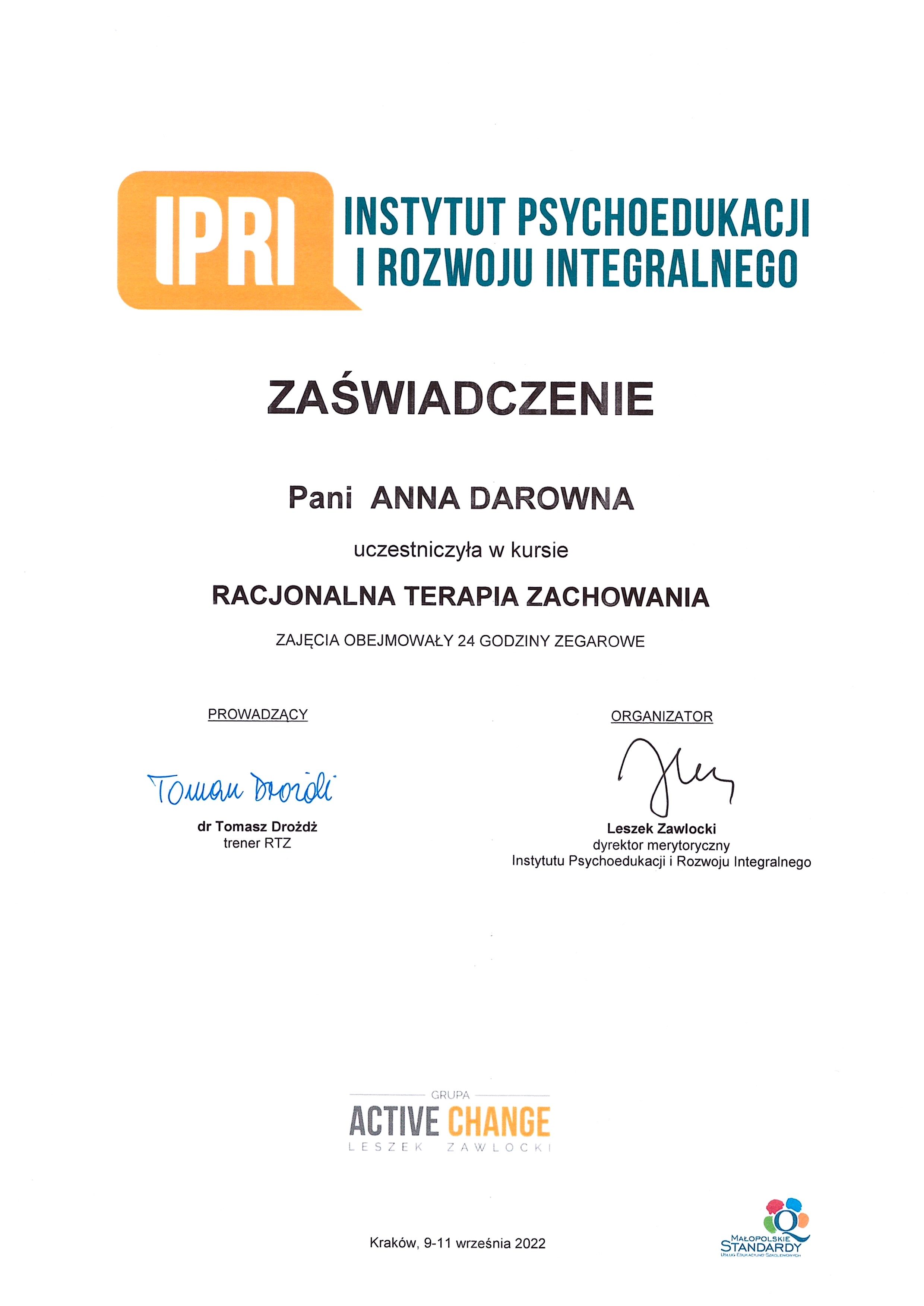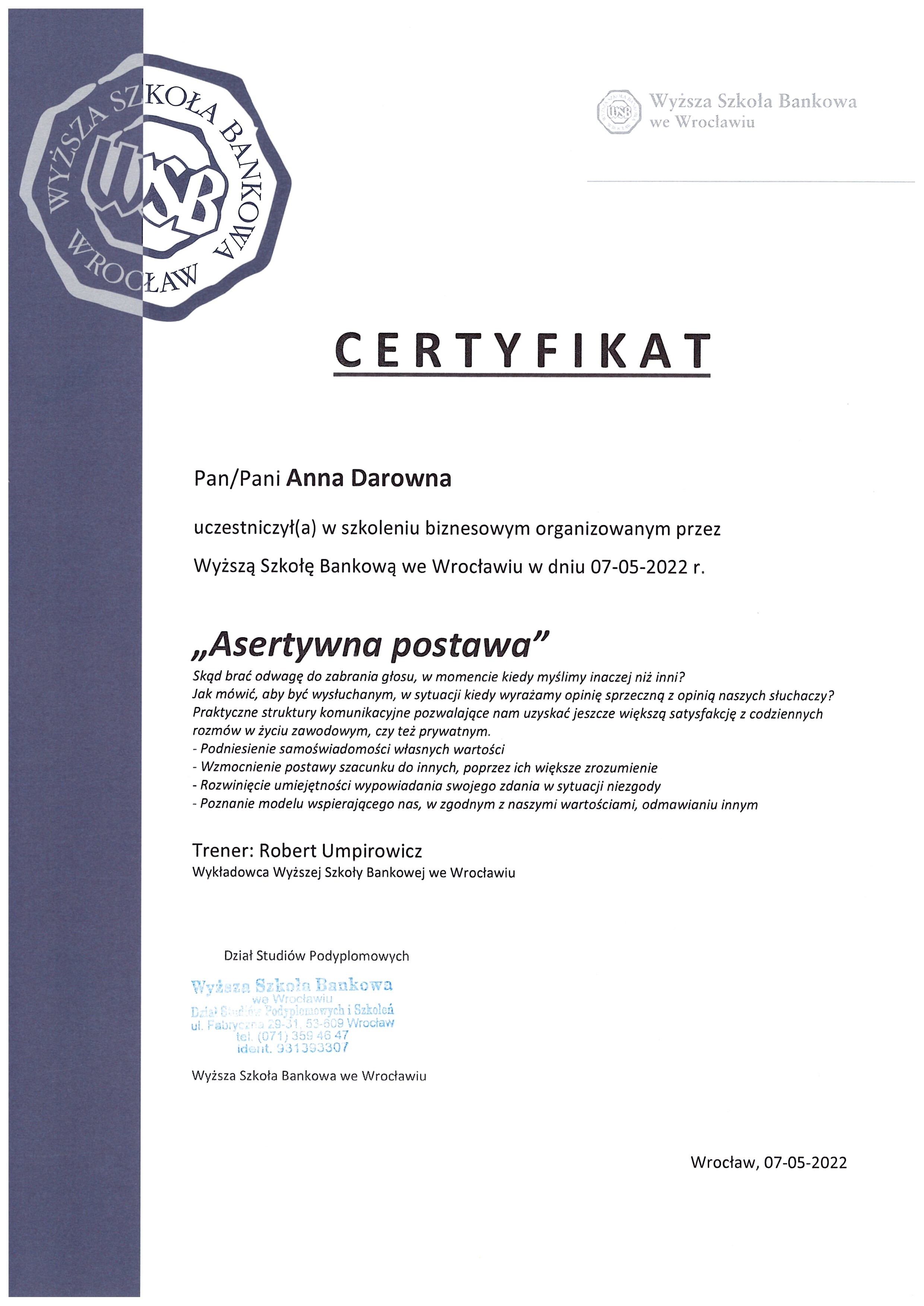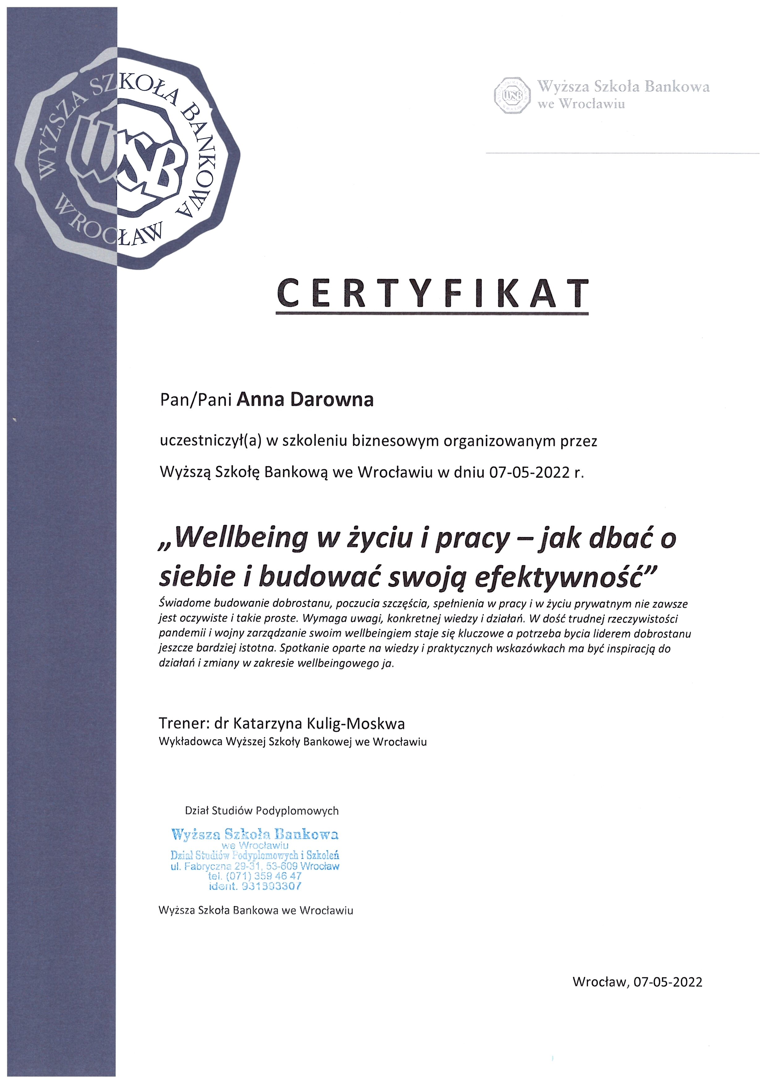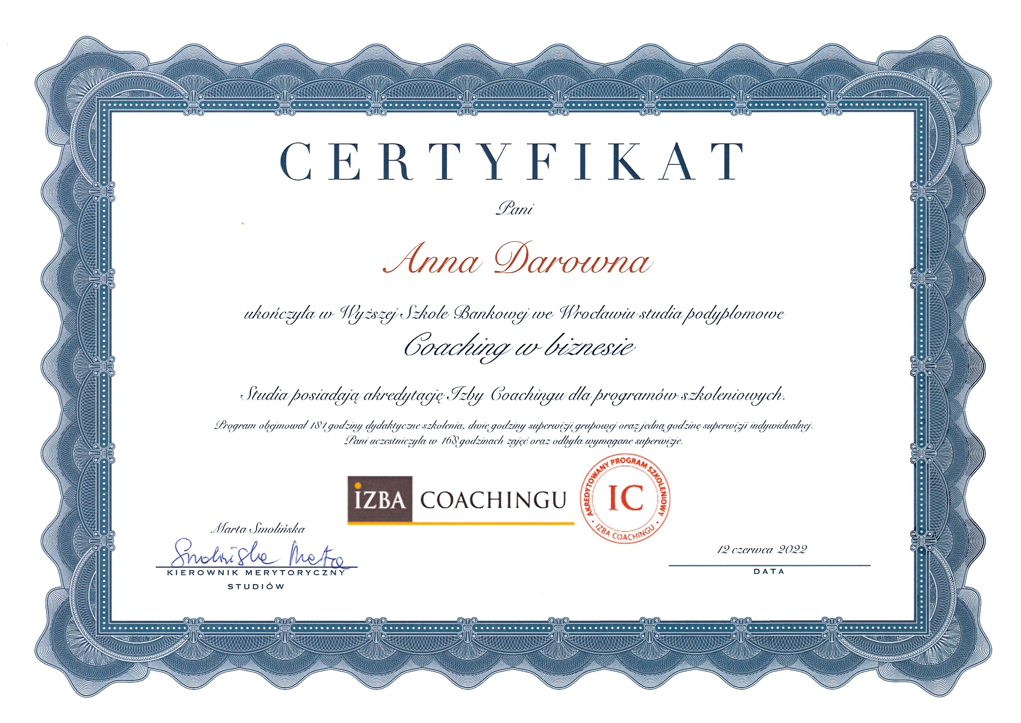 Ukończyłam Coaching w biznesie na Wyższej Szkole Bankowej we Wrocławiu. Studia dały mi solidne fundamenty, jednak moją pasją jest praca z klientem indywidualnym. W związku z tym stale pogłębiam swoją wiedzę i rozwijam się dalej w tym kierunku. Jeszcze będąc na studiach odbyłam szkolenie Wellbeing w życiu i w pracy oraz Asertywna postawa. Ukończyłam również kurs Racjonalnej Terapii Zachowania oraz Terapii Akceptacji i Zaangażowania w Instytucie Psychoedukacji i Rozwoju Integralnego w Krakowie. W planach kolejne tematy, które chcę poznać i pogłębić :)